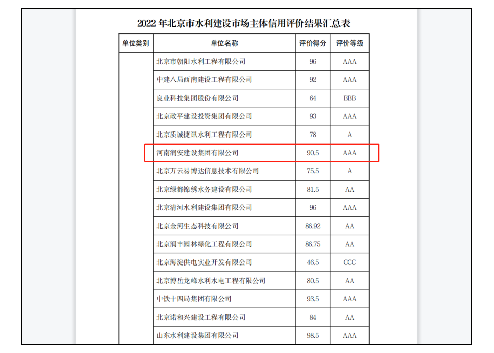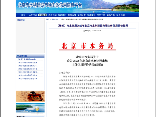 2022年12月22日,北京市水務(wù)局發(fā)布關(guān)于公告2022年北京市水利建設(shè)市場主體信用評價結(jié)果的通知,集團(tuán)公司以90.5的高分通過了此次評價,獲得了高等級AAA級信用評價,為集團(tuán)公司開拓水利業(yè)務(wù)打下了良好的基礎(chǔ)。